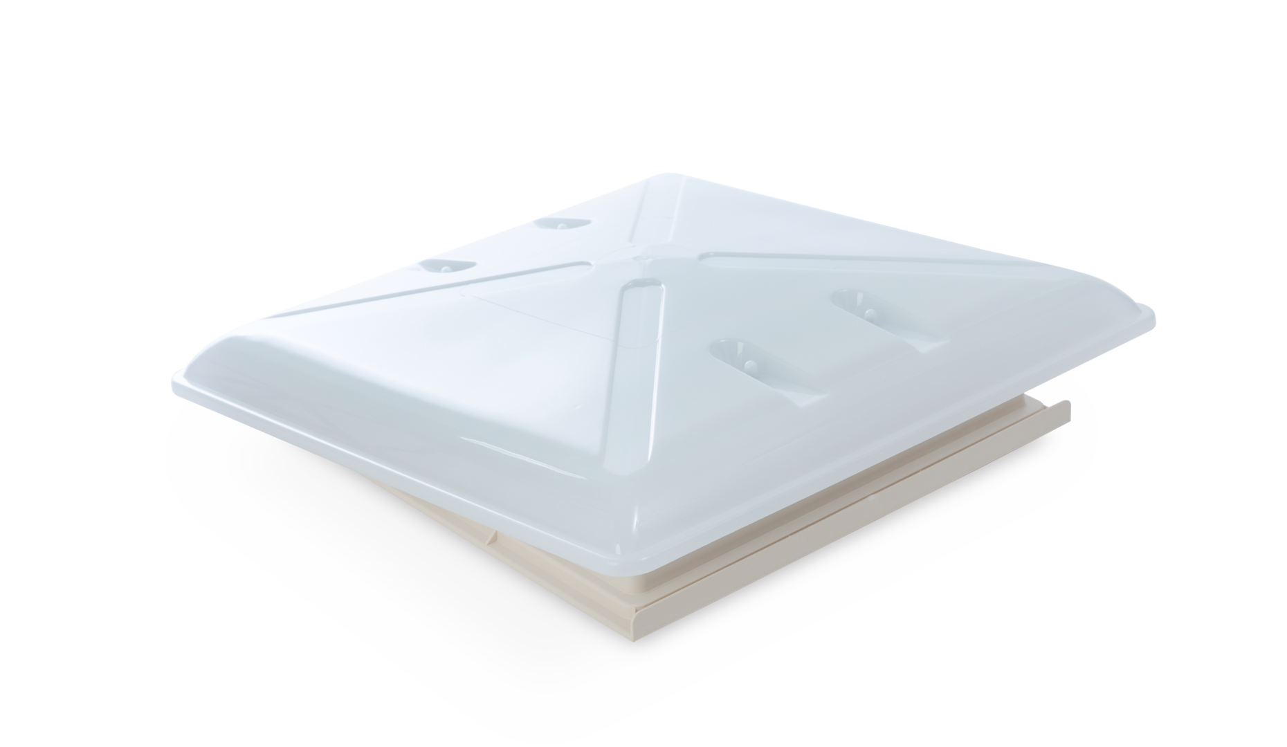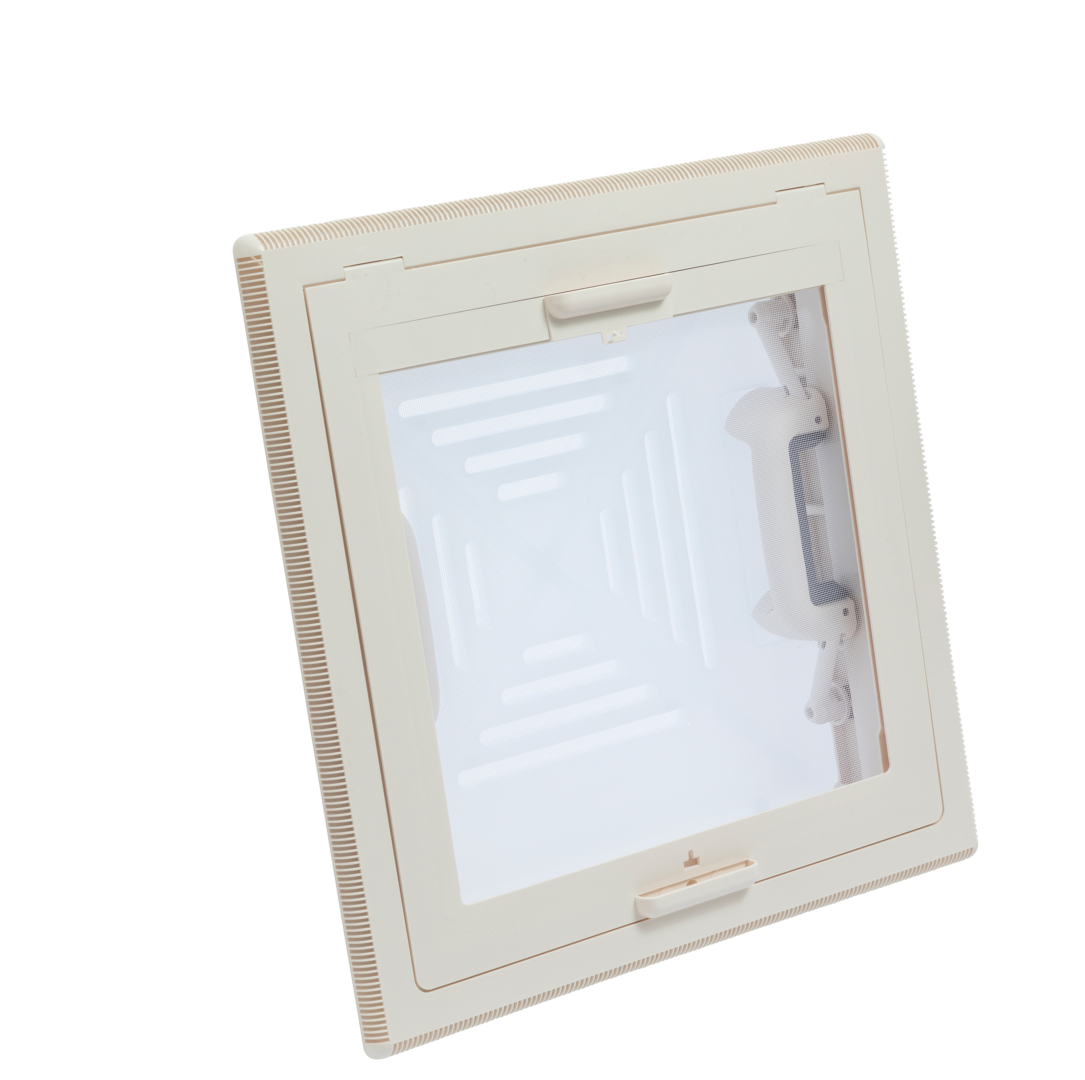 Dachausschnitt 400 x 400 mm. Für Dachstärken 24 – 46 mm. Mit Lüftungshaube 480 x 480 mm, Milchglas, Teleskopausstellern, Tastenverriegelung. Rahmenfarbe beige.