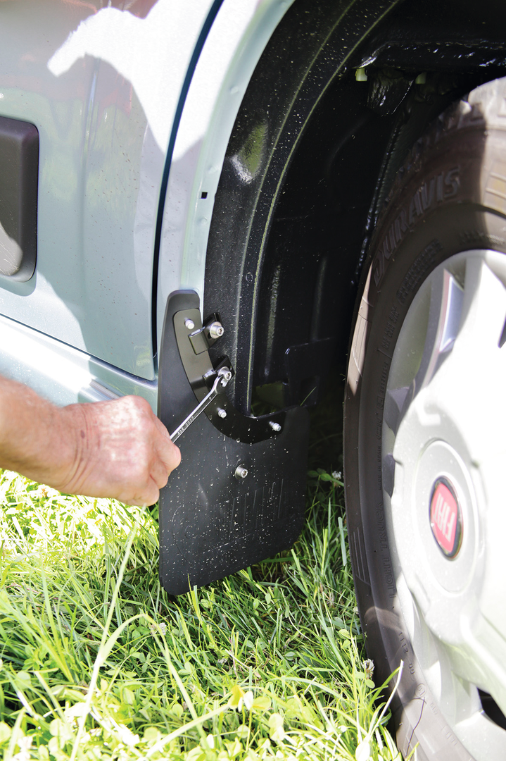 Schmutzfänger aus Gummi mit lackierten Stahlhalterungen.