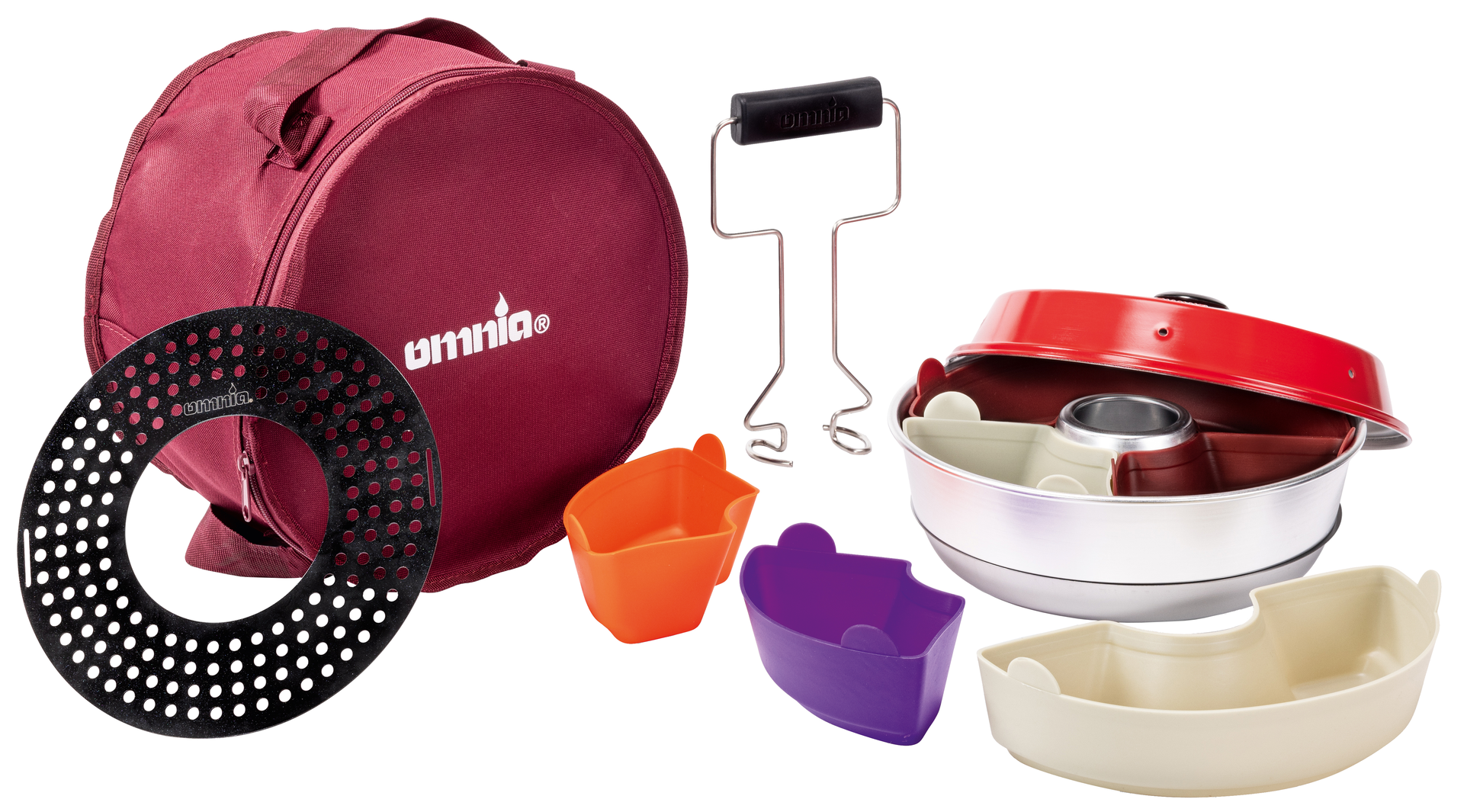 OMNIA Ofen, perforiertes Backblech, 6er-Pack Silikonformen (2 Halb- und 4 Viertelformen), Tragegriff und Tasche zur praktischen Aufbewahrung. Alle Teile des OMNIA Kit 2 finden in der Tasche Platz.