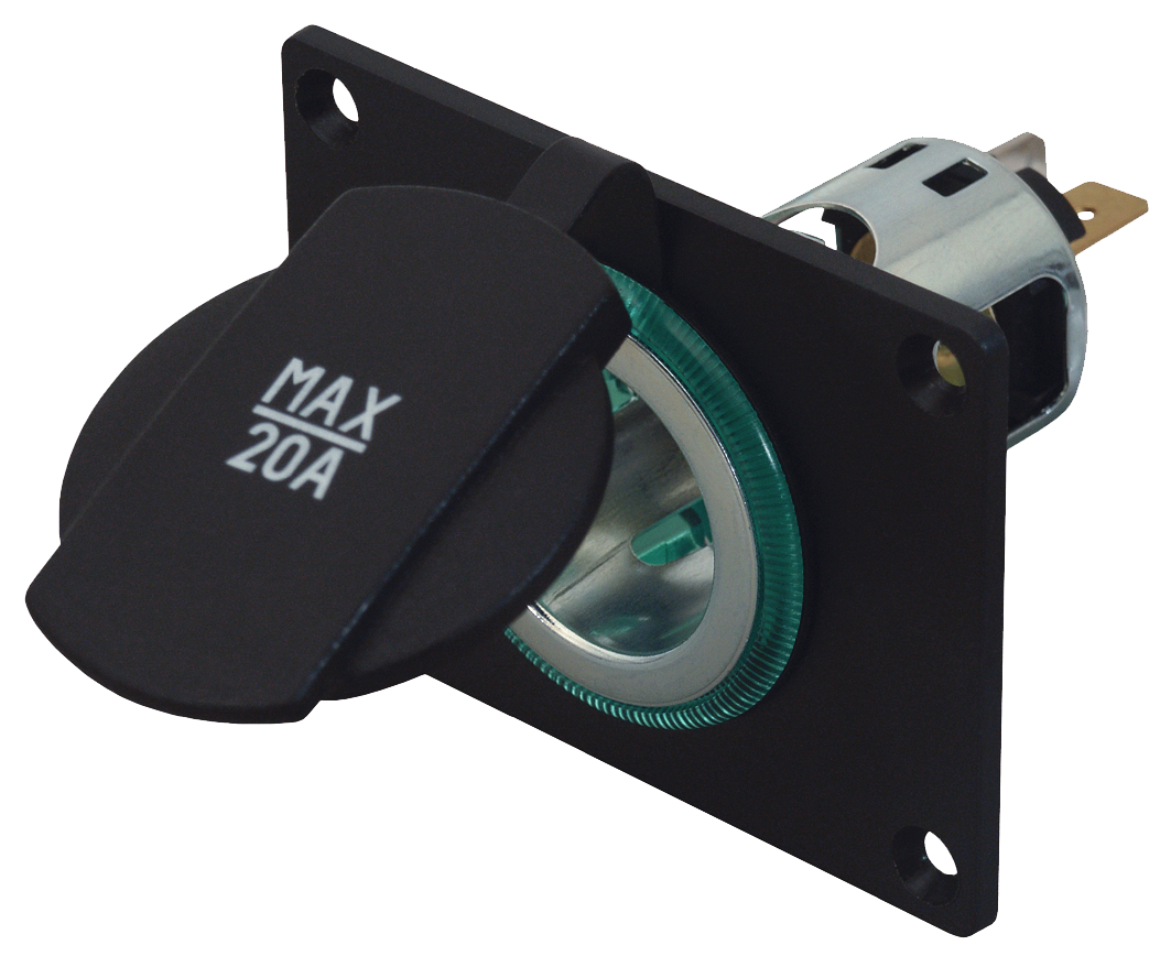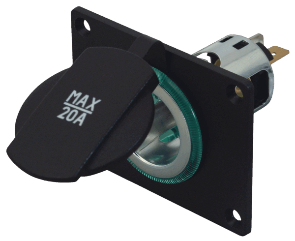 12-24 V mit Spannhülse grün, unbeleuchtet, mit Montageplatte zum Fronteinbau, für z. B. dickwandiges Holz. Max. 20 A bei Kabelquerschnitt 2,5 mm², 16 A bei 1,5 mm². Einbauöffnung 32 mm.