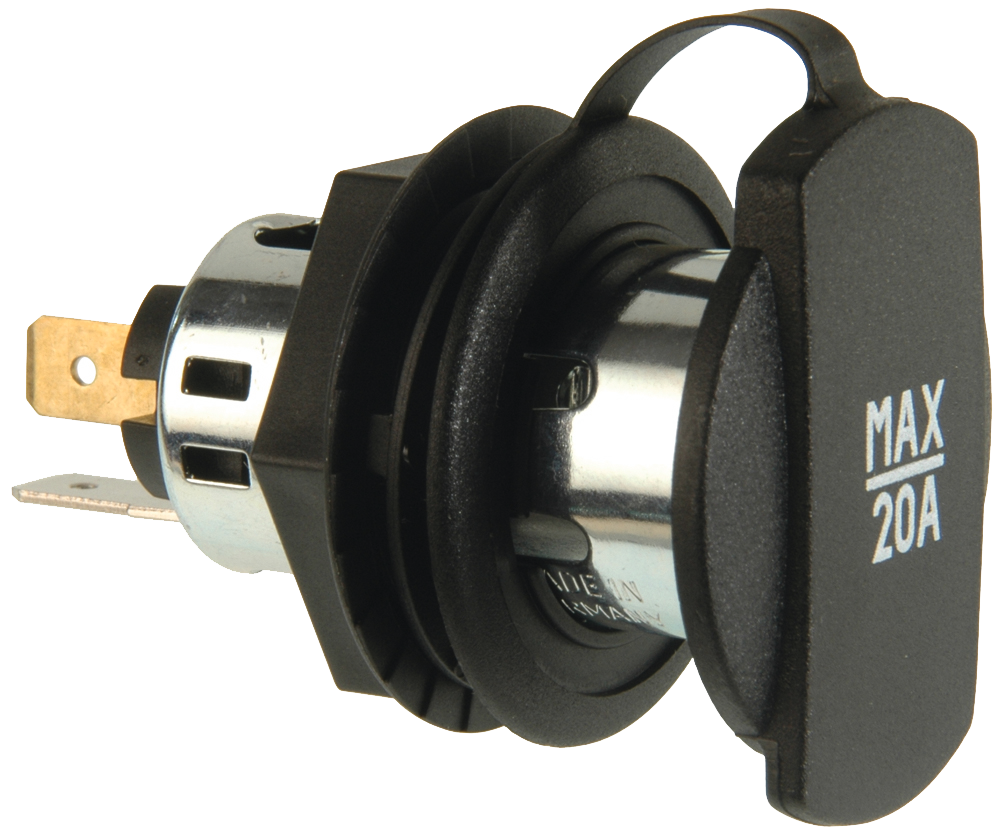 12-24 V, mit Schraubgewinde, max. 20 A bei einem Kabelquerschnitt von 2,5 mm², 16 A bei 1,5 mm². Innen-ø 21 mm, Einbauöffnung 27,8 mm. Befestigung mittels Sechskantmutter.