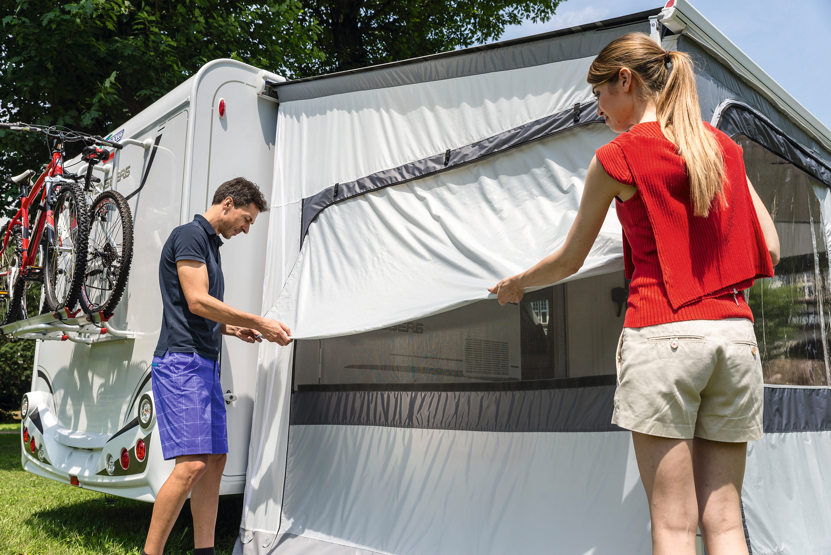 Dank der Dachlüftung besonders für warme Jahreszeiten geeignet. Das doppelte Dach, bestehend aus dem Markisentuch und dem Vorzeltdach aus Ripstop, schafft einen Hohlraum mit konstanter Belüftung, was somit die Innentemperatur auf ein angenehmes Maß reduziert.