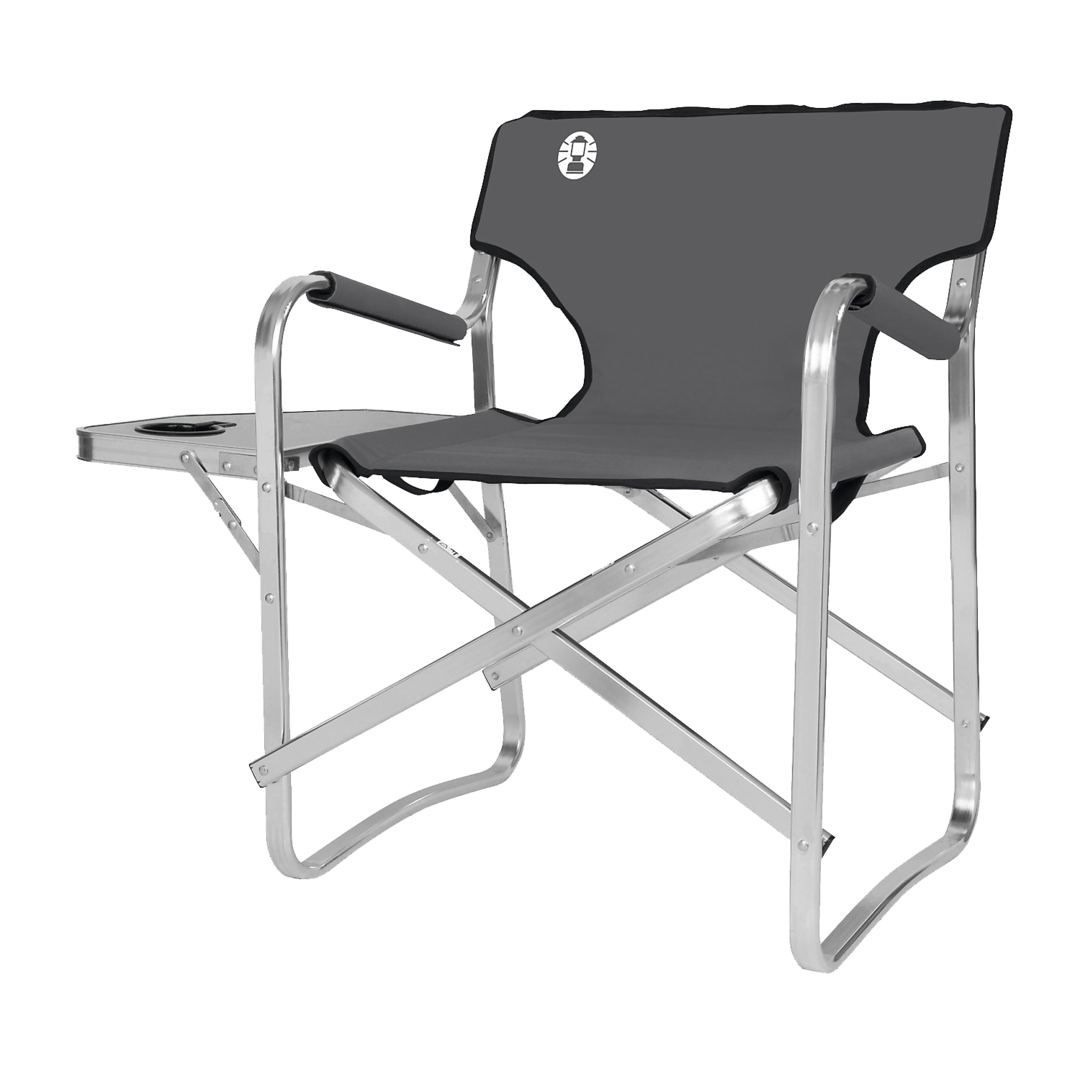 Regiestuhl DECK CHAIR mit Armablage. Bequemer Regiestuhl, auf dessen abklappbarer Seitenablage (28 x 42 cm) mit integriertem Getränkehalter alle wichtigen Dinge griffbereit gehalten werden können. Besonders komfortabel ist dieser Stuhl dank der gepolsterten Rückenlehne und Sitzfläche, der geschäumten Armlehnen sowie der eingearbeiteten Trageriemen. Material: Bezug 600D Polyester Oxford, Rahmen Aluminium. Belastbarkeit 113 kg.