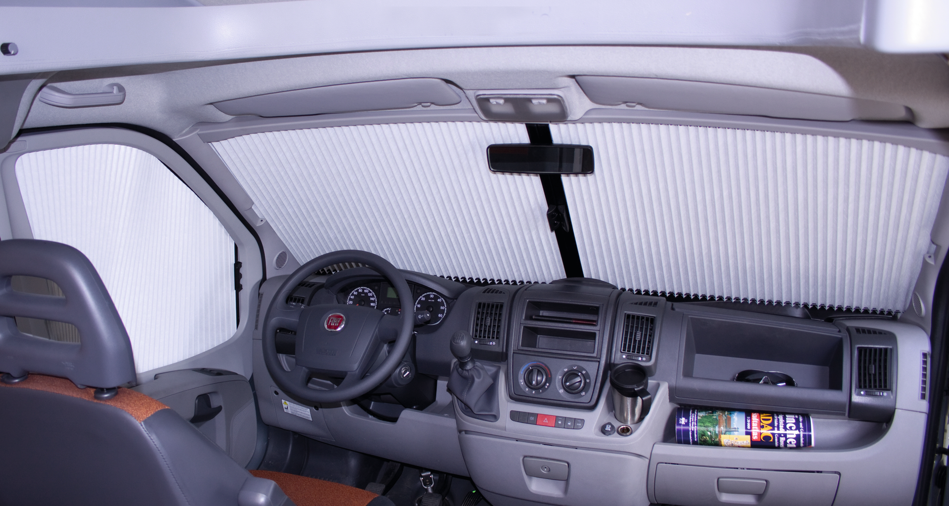 Große Front- und Seitenscheiben am Reisemobil bieten eine schöne Aussicht, aber auch guten Einblick für neugierige Augen und wenn die Sonne vom Himmel brennt, heizt sich der Innenraum durch die großen Flächen schnell auf.