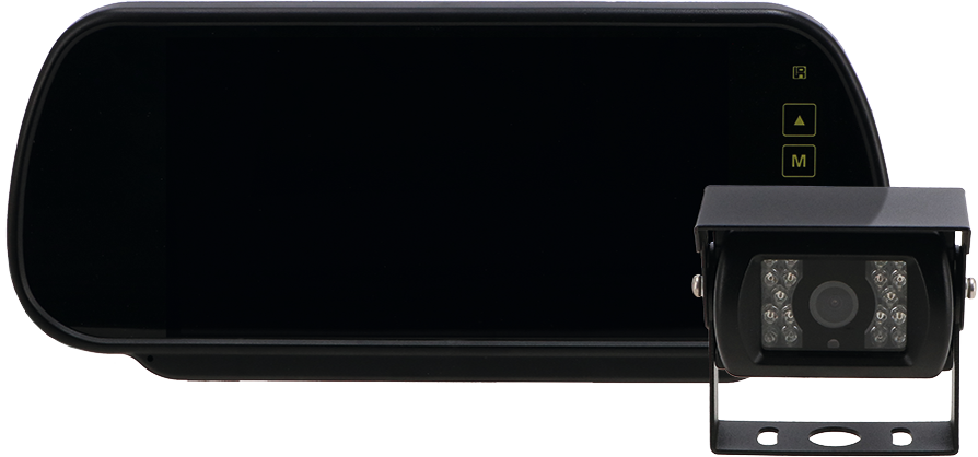 Rückfahrvideosystem mit 7″ Touchscreen-Spiegelmonitor und Farb-CCD-Kamera.