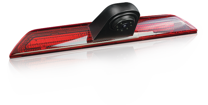 Für Ford Transit, 7. Generation, ab Bj. 2014, Kamera ersetzt die 3. Bremsleuchte, CCD Sensor, Blickwinkel (dia.): 140°, Kamerawinkel dreistufig einstellbar, integriertes Mikro, Nachtsicht IR-LEDs, 3-teiliges 10 m langes Systemkabel mit verschraubten Steckern.
