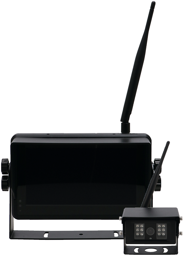Funk-Rückfahrvideosystem mit 7″-Touchscreen- Monitor und Farbkamera. Der Monitor bietet mehrsprachige Unterstützung und ermöglicht die Anpassung von Helligkeit, Kontrast und Farben sowie