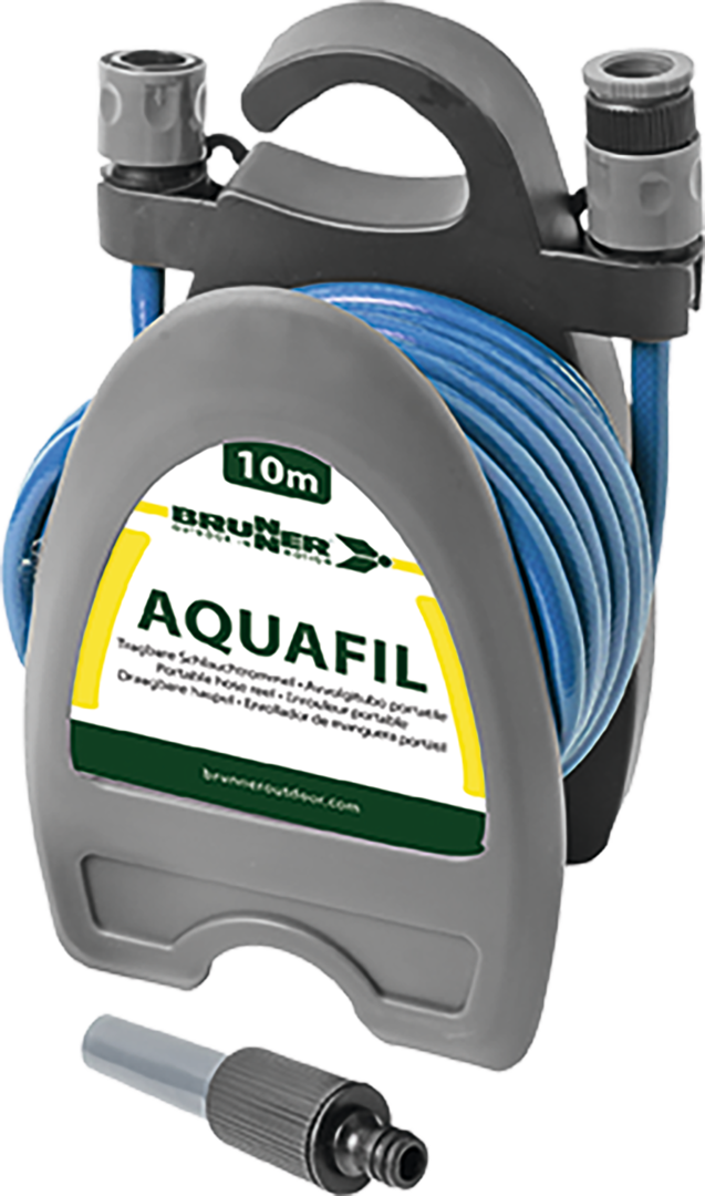 Schlauchtrommel AQUAFIL. Tragbare Schlauchtrommel mit lebensmittelechtem ⅜“ PVC-Schlauch und 2 Schnellkupplungen. Gestell aus widerstandsfähigem Kunststoff. Kompakt, leicht und einfach zu transportieren. Komplett mit Spritzdüse. Geeignet für eine Vielzahl von Anwendungen.Schlauchlänge 10 m.