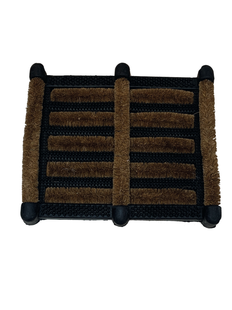 Schuhabstreifer mit Holzgestell. Unten und seitlich angebrachte Bürsten sorgen für die gründliche Reinigung beider Schuhe.