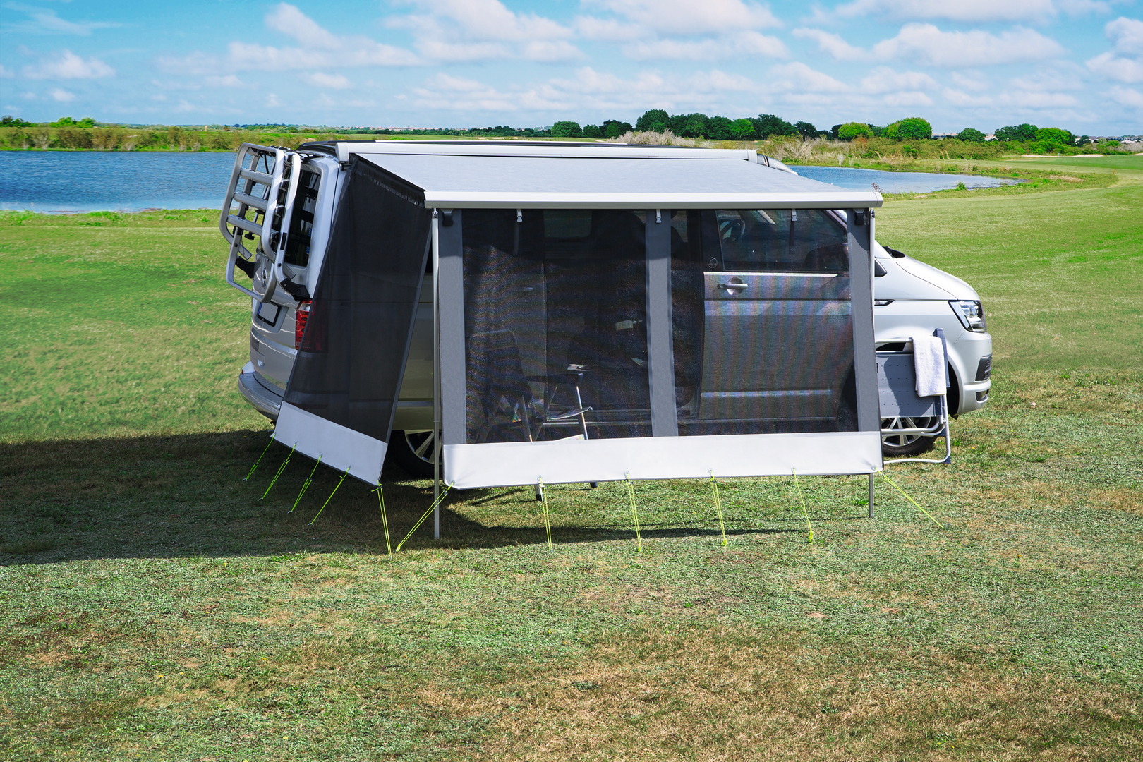 Adaptieren Sie weitere Sonnenschutz-Wände an Ihre Markise, um sich zusätzlich zu schützen. Die Wandteile Happy Sun sind aus Mesh-Gewebe gefertigt, reduzieren die Lichteinstrahlung und dienen ebenso als Windschutz.