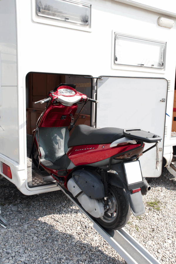 Über die geführte Schiene läuft der außerhalb des Fahrzeuges verzurrte Roller gerade in die Garage, ohne den Lenker zu verkanten.
