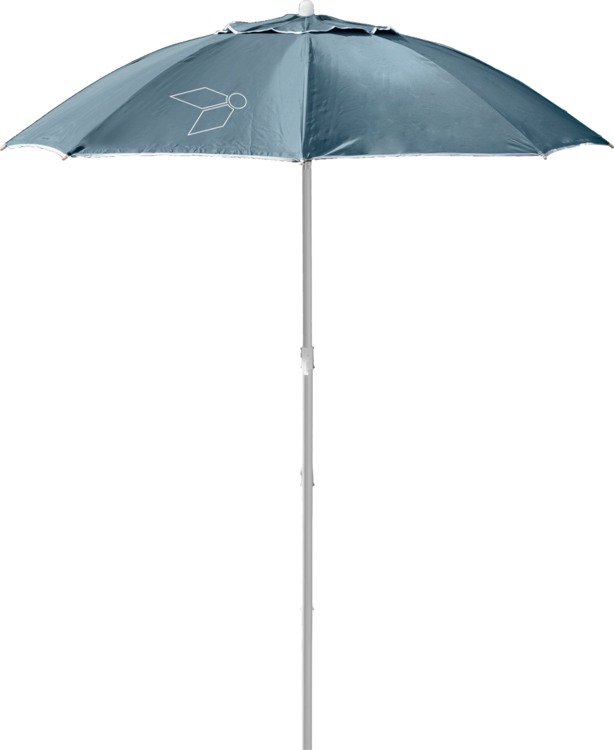 Sonnenschirm BEACH PARSOL XL 200. Smarter Strand-Sonnenschirm mit speziell angebrachten Befestigungsbändern, die eine Montage von schattenspendenden Seitenwänden ermöglichen. Bespannung 100 % Polyester, Sonnenschutz UPF 50+, Alu-/Fiberglasmast.