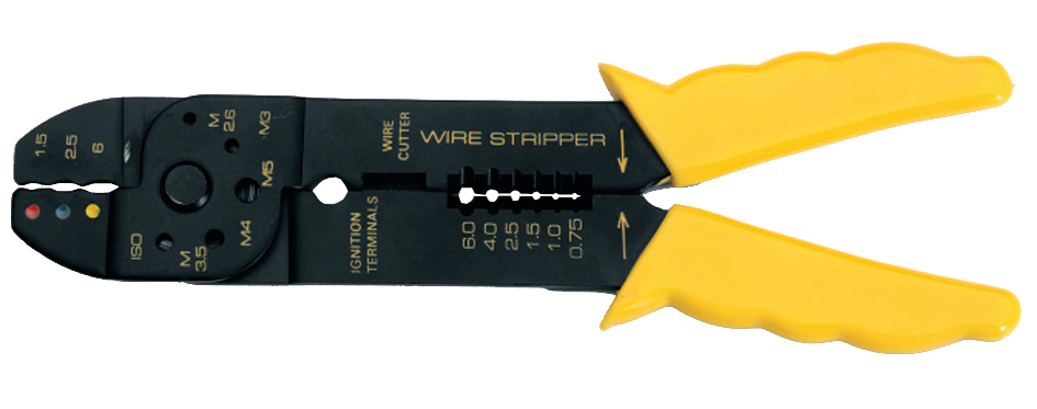 Für isolierte Quetschverbinder. Geeignet zum Bolzenschneiden mit Gewinde nach ISO von M2,6 – M3,5 und zum Kürzen und Abisolieren von Leitungen von 0,75 – 6,0 mm². Leitungsquerschnitt von 0,5 – 6,0 mm² (rot, blau, gelb).