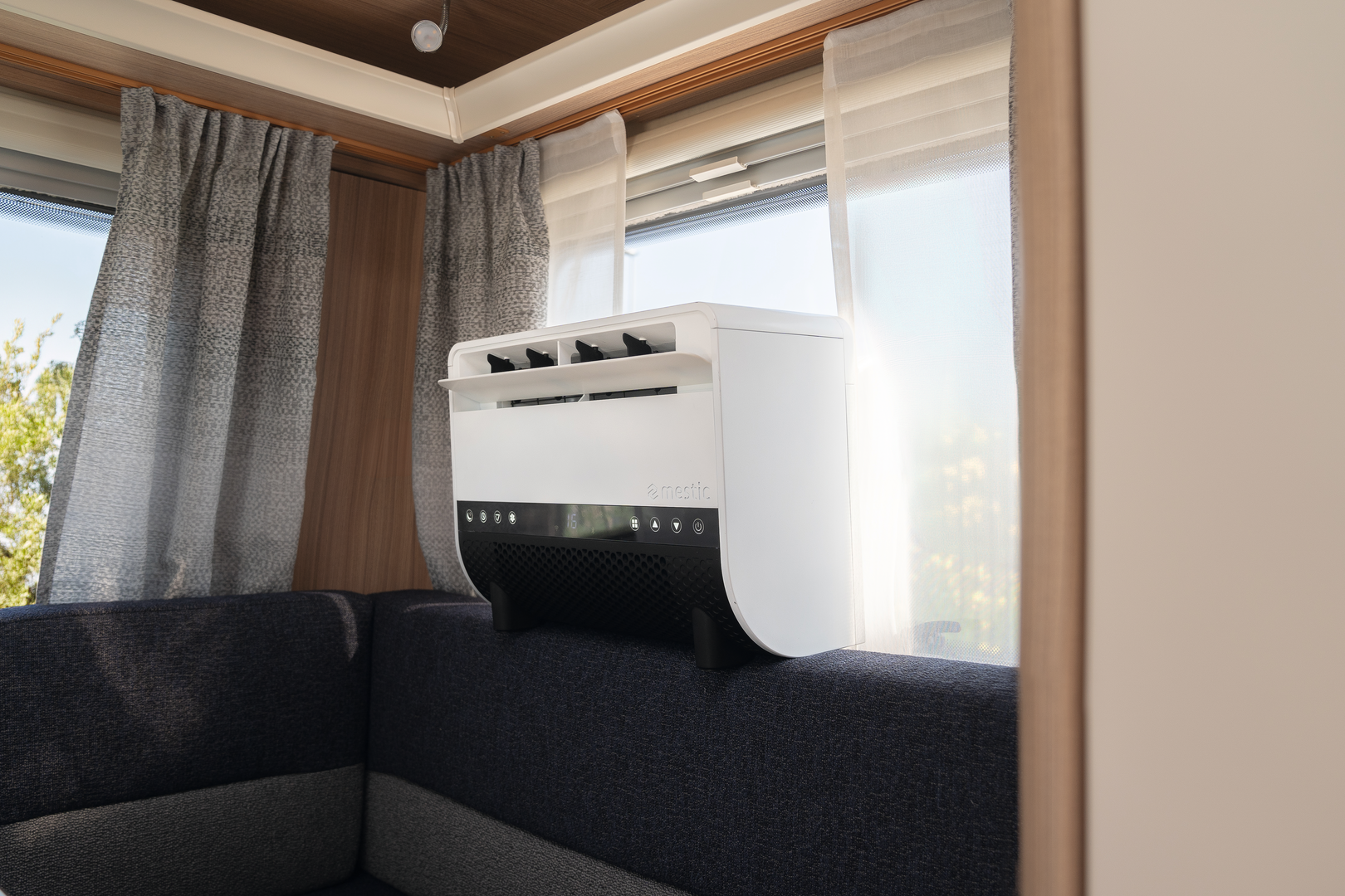 Mit der Split-Klimaanlage von Mestic bleibt es an heißen Tagen in Ihrem Wohnwagen oder Wohnmobil angenehm kühl. Hängen Sie das Klimagerät einfach in die Fensteröffnung. Die innovative Split-Klimaanlage besteht aus zwei Teilen: dem Verflüssiger (Außeneinheit) und dem Verdampfer (Inneneinheit). Diese sind durch flexible Schläuche durch das Fenster verbunden. Die Schläuche sind so dünn, dass das Fenster auf Kipp geschlossen werden kann. Diese Klimaanlage hat einen niedrigen Geräuschpegel. Der Lüfter kann nach links und rechts geschwenkt werden.