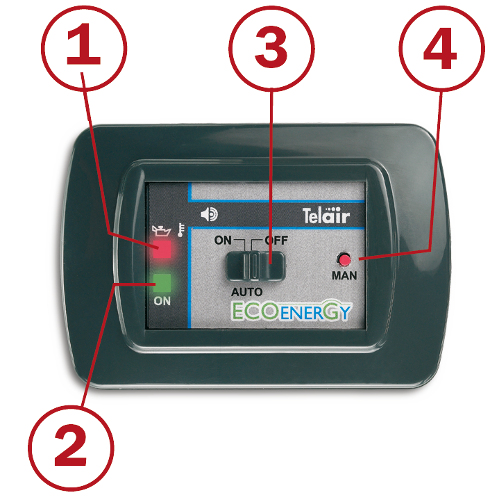 Man betätigt diese Taste, wenn man den Generator anlassen möchte, obwohl die Batteriespannung höher als die einprogrammierte Schwelle von 11,9 Volt ist. Wenn die 14,5 Volt Spannung erreicht wird, schaltet sich der Generator automatisch aus und bleibt im „Stand-by“.