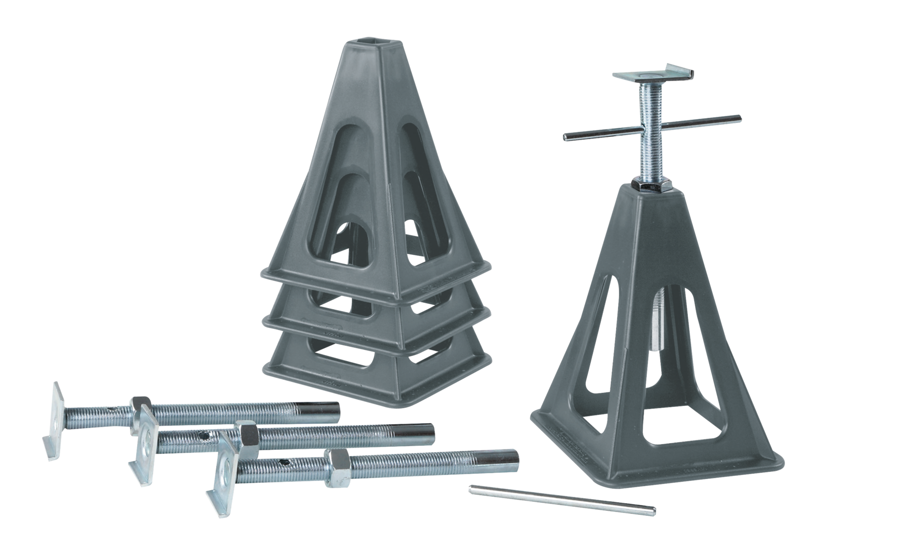 Platzsparend stapelbar. Verstellbar von 31 – 46 cm. Tragkraft/Stütze 750 kg. Gewicht pro Satz 3,2 kg.