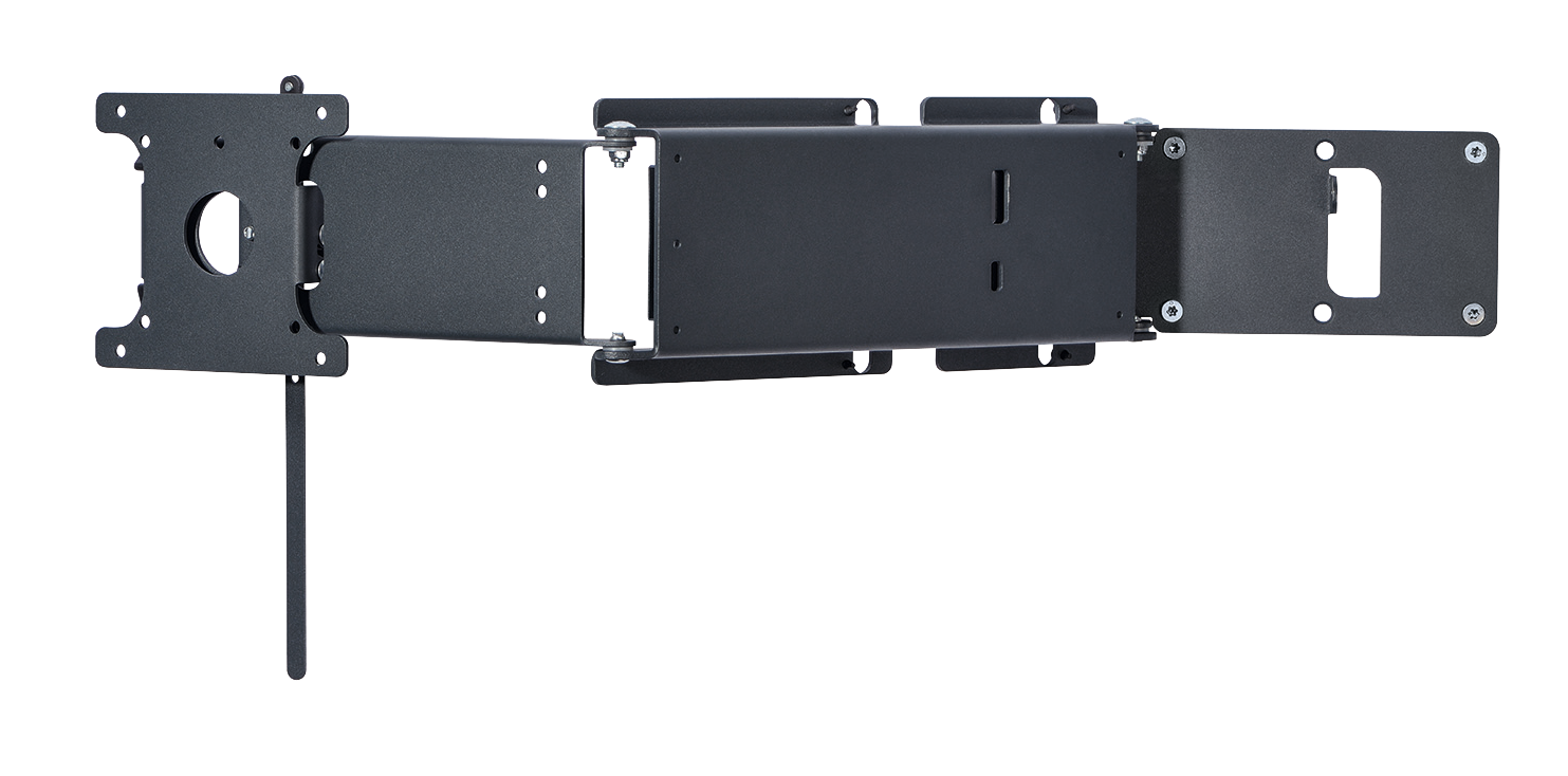 Mit Arretierung in 0-Position zur Sicherung des Bildschirms. Entriegelungshebel oben und unten montierbar. Inklusive Neigungsverstellung von +/- 10°. Belastbar bis 7 kg. Wandabstand 33,5 – 156,5 mm, schwenkbar bis 180°. Farbe Schwarz.