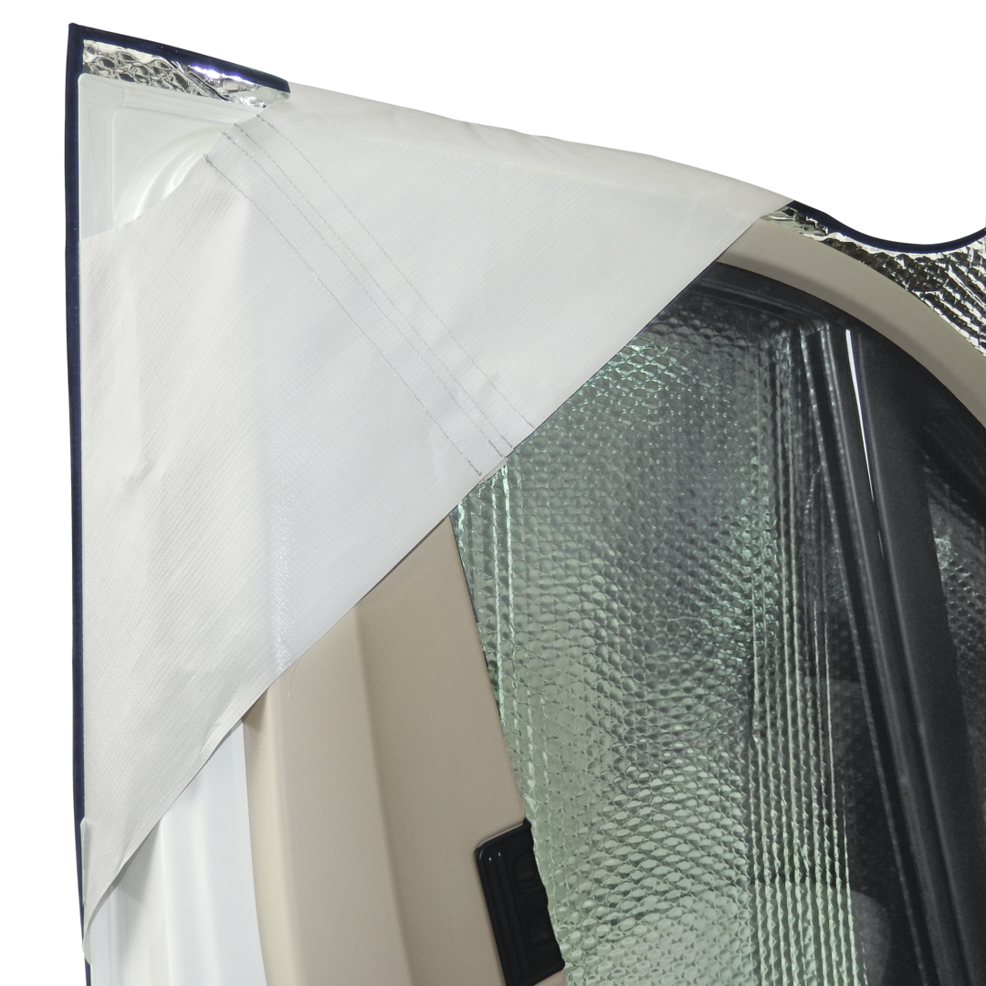 Bei schönem Wetter können Sie die Front öffnen und die Natur oder das Geschehen außerhalb des Fahrzeugs beobachten. Hergestellt aus einer wetterfesten Thermofolie mit beidseitig alubedampfter Polyesterfolie, die UV-stabilisiert worden ist.
