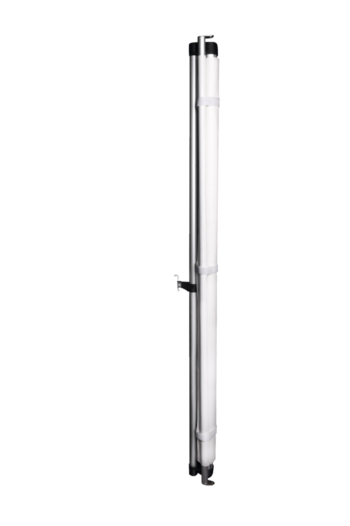 • Einfach abrollen und am Stützfuß anbringen oder freistehend mit dem mitgelieferten Abspann-Set aufstellen.