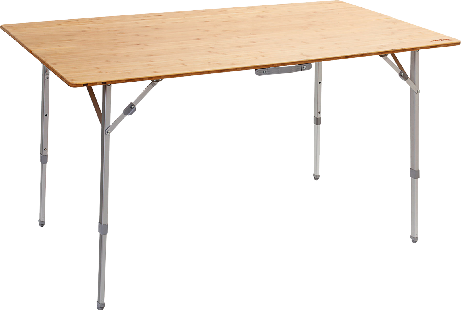 Freizeittisch mit Metallgestell und Bambus-Tischplatte.