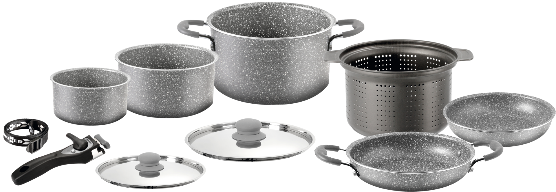 Alu-Topfsets mit langlebiger 4-facher Antihaft-Beschichtung und hoher Kratzfestigkeit. Induktionsgeeignet.