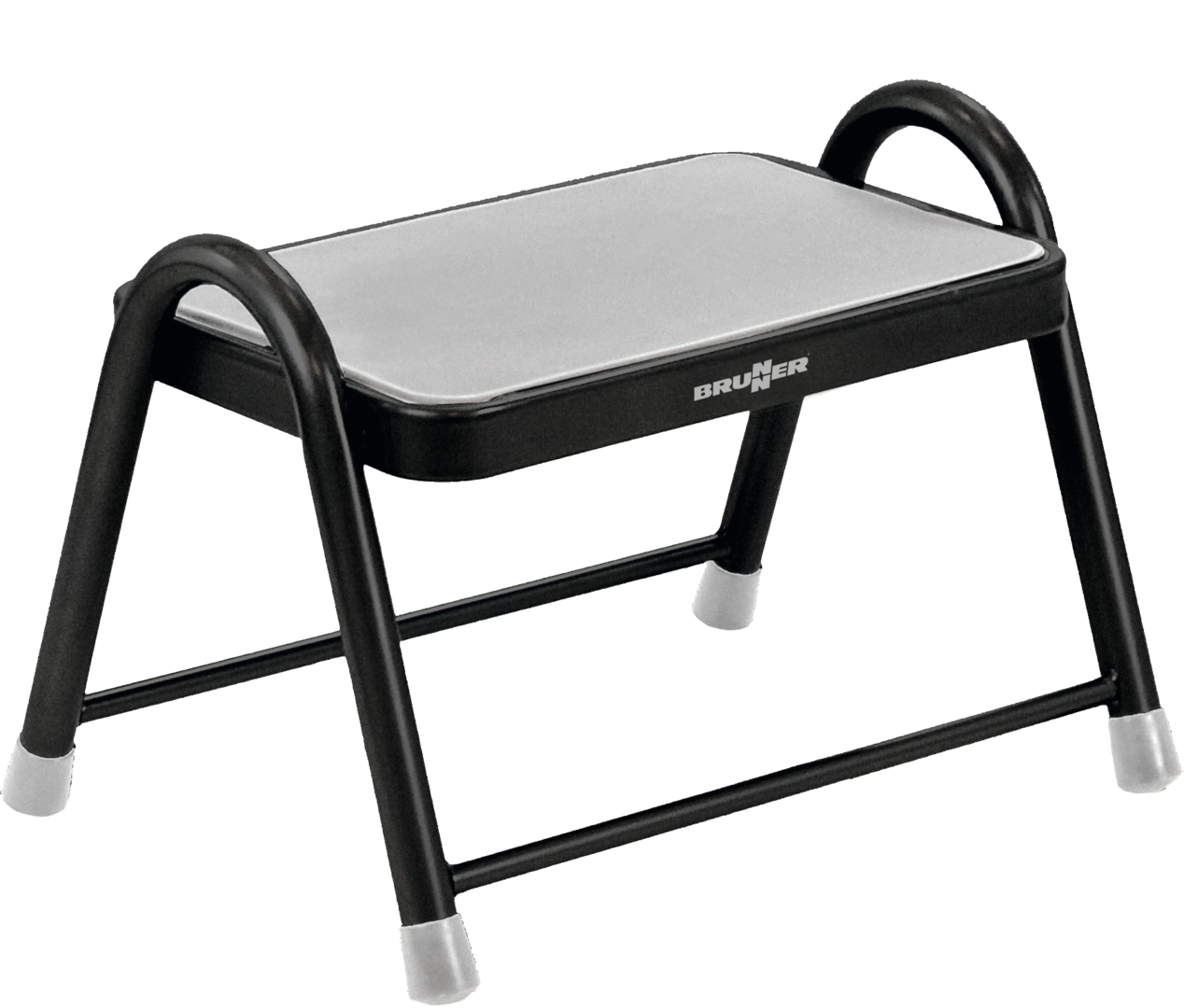Einzeltrittstufe mit stabilem Stahlgestell und rutschfester Gummi-Trittfläche.