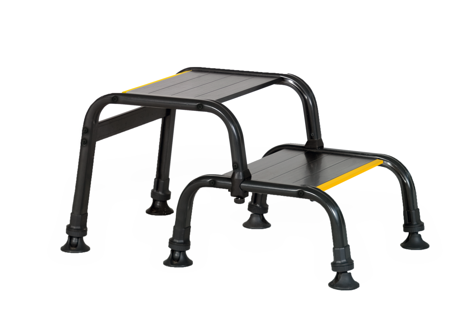 Doppeltrittstufe mit sehr guter Stabilität. Das Führungssystem bietet ein kompaktes Packmaß während des Transports oder der Lagerung.