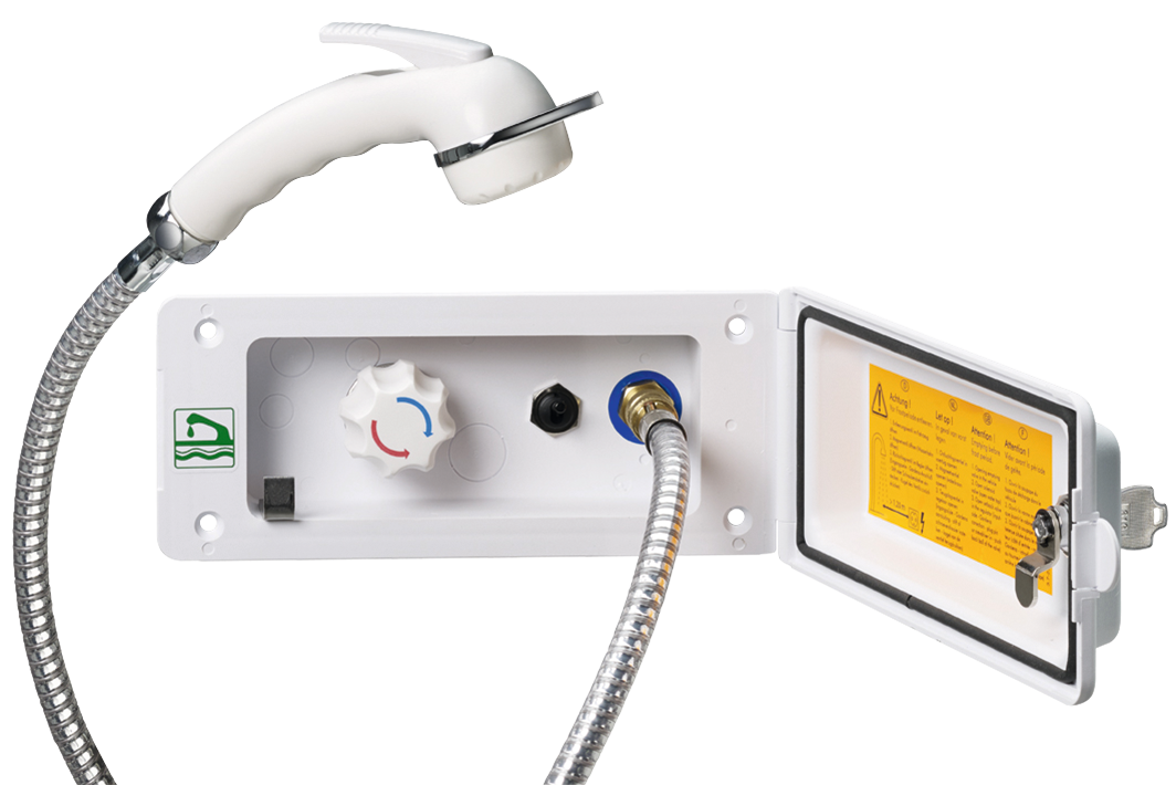 Zur Entnahme von Wasser/Warmwasser, mit Vormischer für Wasserentnahme, Stellbrause CHARISMA, 1,5 m Schlauch, Schnellkupplung und Schloss.