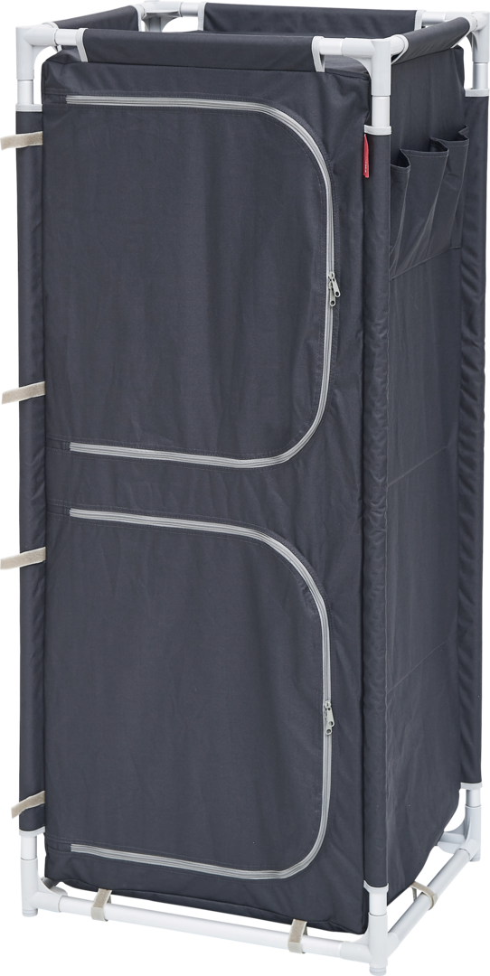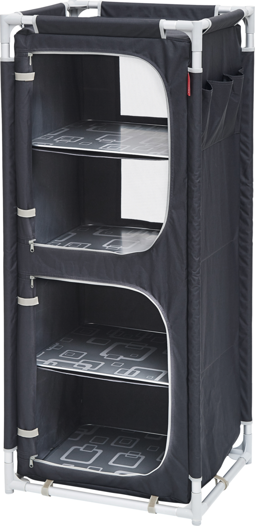 Äußerst kompakt, vier gemusterte Ablageböden, drei Seitentaschen. Belüftung auf der Rückseite. Rahmen ø 25 mm.