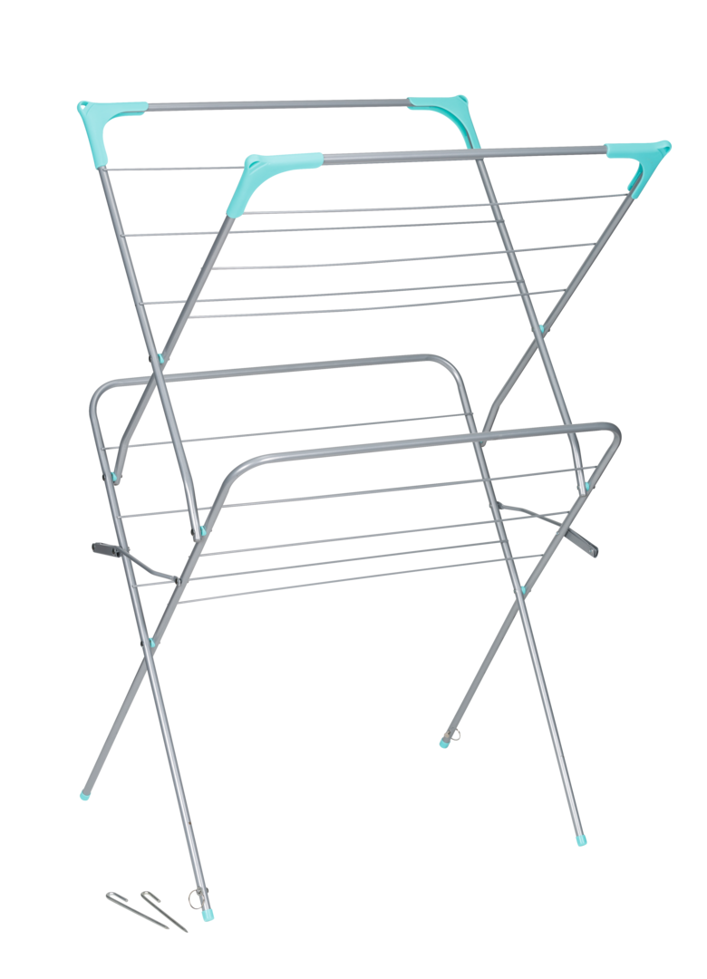 Die seitlichen Sicherungsbügel ermöglichen einen sicheren Stand, zusätzlich kann der Wäschetrockner mittels der Zeltnägel (im Lieferumfang enthalten) befestigt werden.