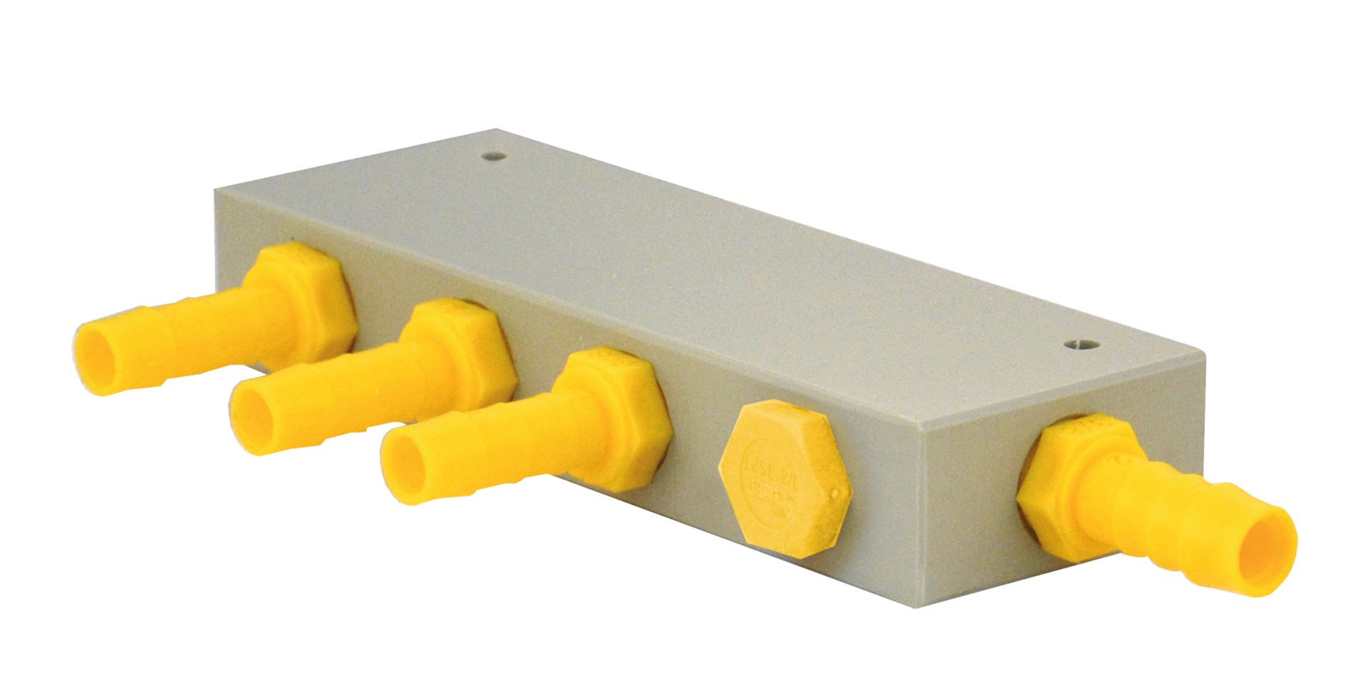 Wasserverteilerblock-WeißGELB®. Zur zentralen Wasserverteilung an einem Ort, mit Befestigungsbohrungen. Optimaler Durchfluss, stabil, frostsicher, druckfest, trinkwasserecht. 8 bar max.