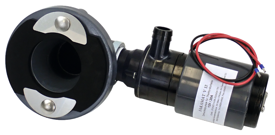 Die Fäkalien werden dann per Knopfdruck zerhackt und abgepumpt. Der Ausgang der Pumpe ist nur 30 mm groß. Die Fäkalien können über einen Flexschlauch in einen darunterliegenden Fäkalientank geleitet werden. Auch im Kanalbetrieb zu verwenden.