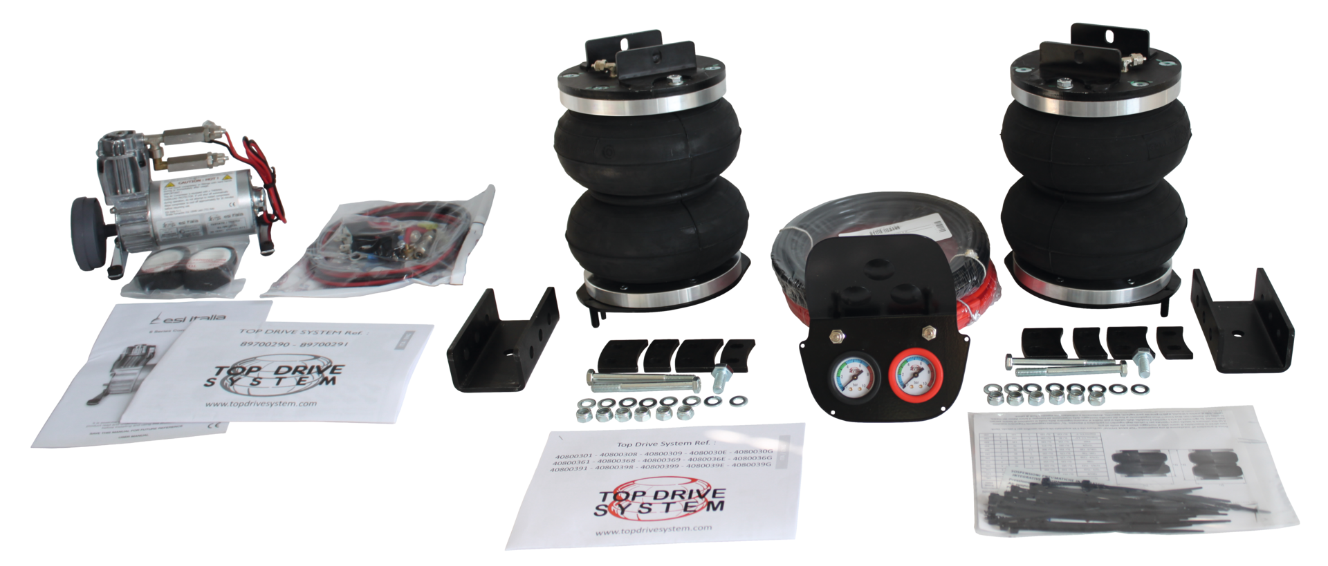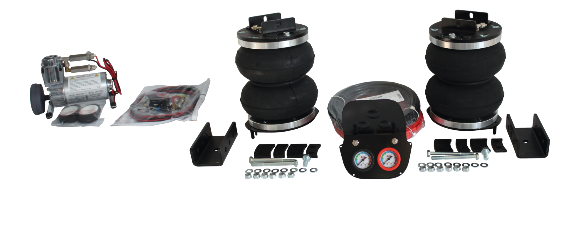 Zusätzliche Eigenschaften: Die Federung bleibt angenehm weich und komfortabel. Die Gummigewebe-Wandungen der Bälge und der Kompressor werden dank des geringen Luftdrucks geschont. Sicherheits-Schlauchdrossel-Rückschlagventile in 6 mm dicken Schläuchen, 2 Druckmanometer und 2 Füll-/Ablassventile. Durch Druckerhöhung zu Rangierzwecken kann das Heck weit angehoben werden, insbesondere während der Fährenbenutzung. Eine Seitenneigung wegen asymmetrischer Gewichtsaufteilung kann ausgeglichen werden und das Fahrzeug kann in geparktem Zustand auf unebenem Boden geradegestellt werden. Regelungs-Technik im Zweikammer-System, alle Zusatz-Luftfedern inklusive Zweifaltenbälgen, 12 Volt-Hochleistungs-Kompressor und Fahrerhausbedienteil.