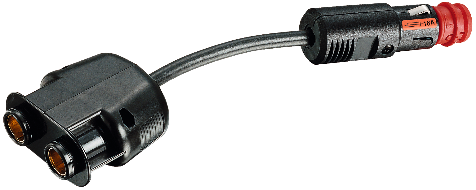 Zwei Normsteckdosen mit Kontakten nach DIN EN ISO 4165, max. 16 A/12-24 V, flexibler Anschluss an das Bordnetz über den TÜV-geprüften Sicherheits-Universalstecker mit auswechselbarer 16 A-Sicherung.